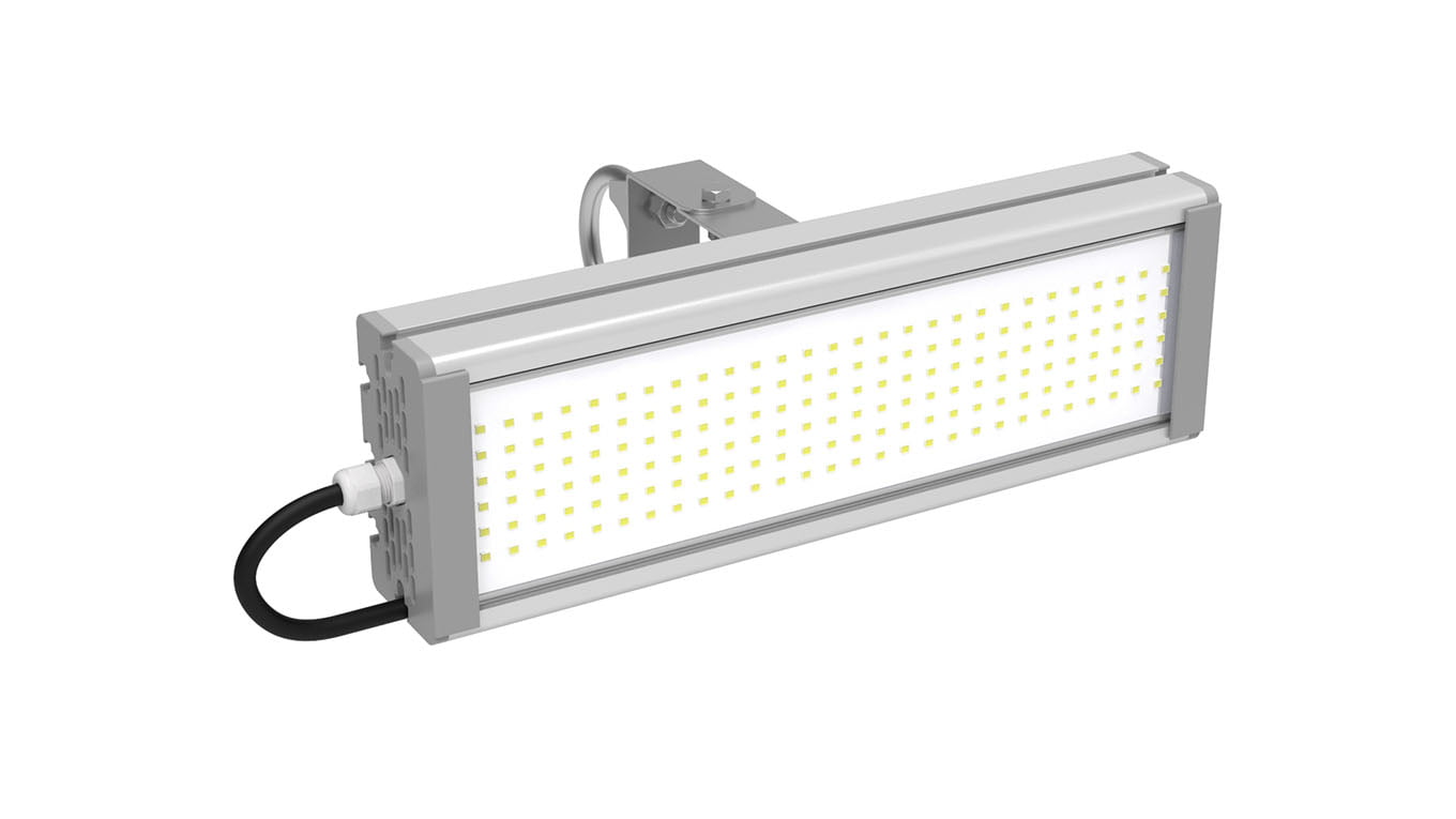 Светодиодный светильник для освещения промышленных объектов, прилегающих территорий и дорог местного значения. Может быть установлен на ровную поверхность с помощью поворотного кронштейна или на трубу диаметром до 50.8мм, с помощью входящего в комплект хомута. Имеет высокую световую отдачу.